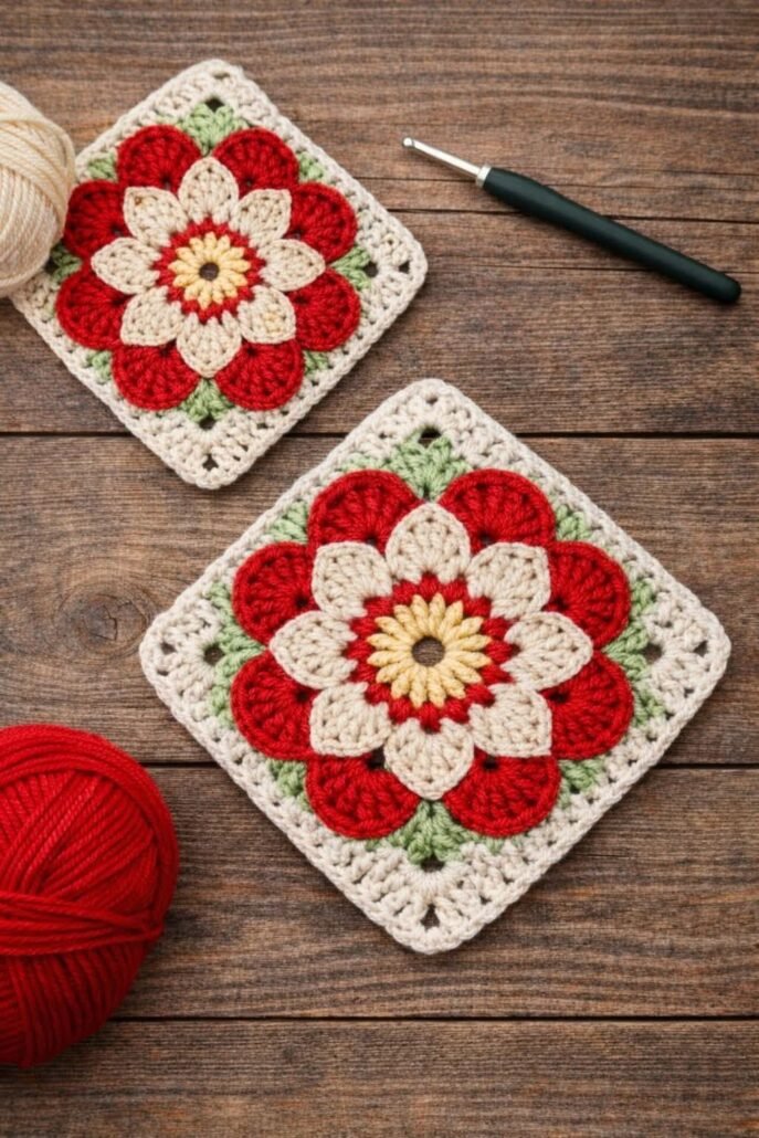 Crochet Square with Popcorn Flower – Tutorial