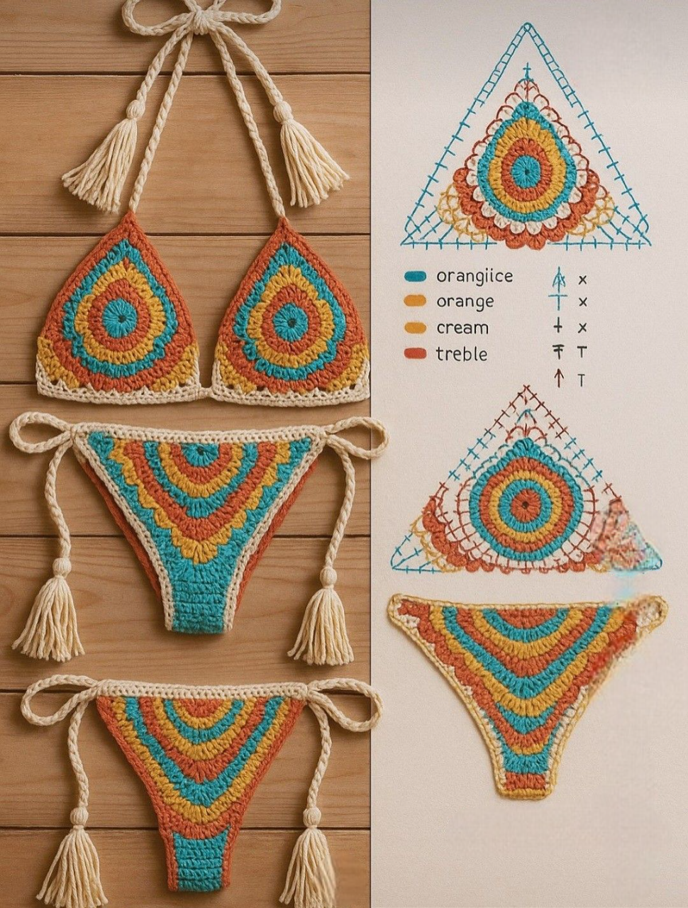 The construction of a crochet bikini for beginners usually starts with the top. Most beginner patterns use simple triangle cups, which are worked from the bottom up or from the center outward.