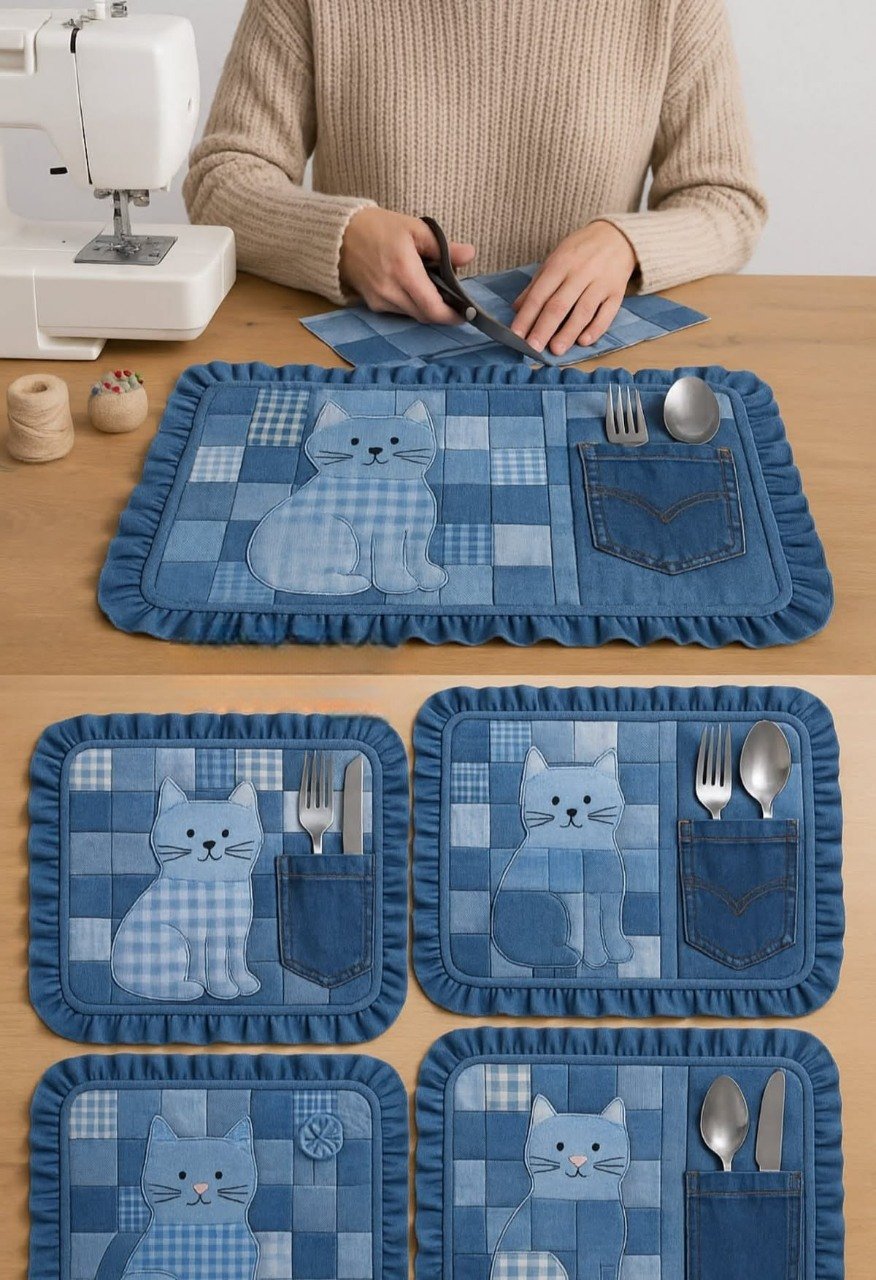 In this complete DIY Denim Quilted Cat Placemat – TUTORIAL, you will learn how to select the right materials, prepare and cut denim pieces, assemble the quilted placemat, and finish it with professional details. This guide is suitable for beginners and experienced quilters alike.